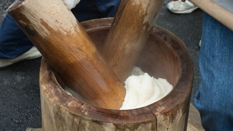 米を固めてつくるおもちは更に強い力を持つとされ、お祝いごとや特別な日であるハレの日には、もちつきを行うようになりました。お正月には鏡もちを神様と共に食べるなどいまも息づいている文化です。
